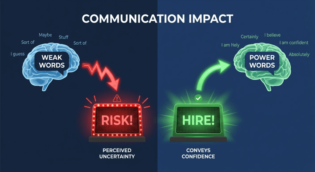 کلماتی که ما به کار میبریم، مستقیماً بر روی ذهن شنونده تأثیر میگذارند. کلمات ضعیف مانند Maybe و I think، در ذهن مصاحبهکننده سیگنال «ریسک» را فعال میکنند. آنها با خودشان فکر میکنند: «این فرد به خودش مطمئن نیست، چطور میتواند برای شرکت ما مفید باشد؟»